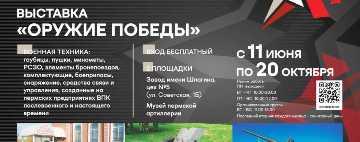 С 11 июня по 20 октября в рамках фестиваля на территории культурно-рекреационного пространства «Завод имени Шпагина» (Советская, 1Б, цех № 5) работает полномасштабная выставочная экспозиция, посвященная истории, достижениям и будущему предприятий военно-промышленного комплекса Перми и Пермского края. Выставка включает в себя уникальные экспонаты и архивные материалы, действующие образцы военной техники. Вход на выставку бесплатный, экскурсии по предварительной записи.